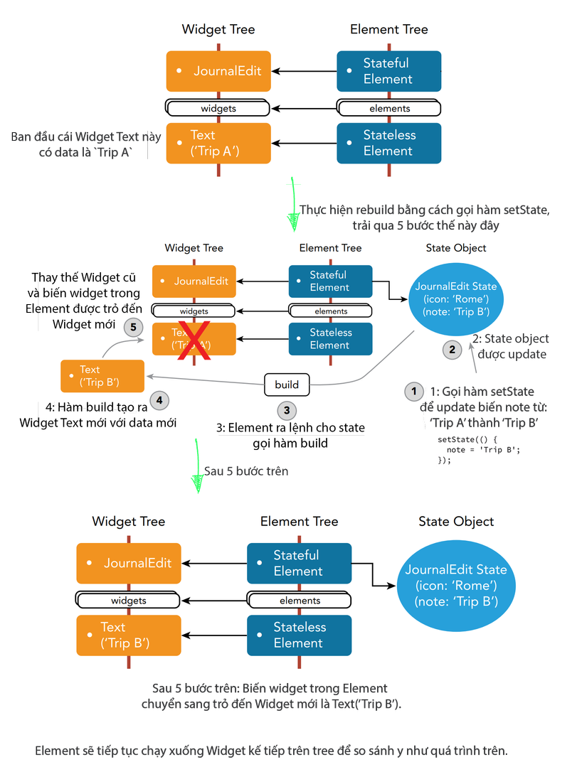 Cái ảnh đã nói lên tất cả. Bạn đã hiểu Mỗi lần rebuild thì Element được update là như thế nào chưa. Nhìn hình cũng thấy Widget cũ mà Element đang trỏ tới là Text('Trip A') bị đập đi và biến widget trong Element chuyển sang trỏ đến Widget mới là Text('Trip B'). Như vậy: Element và State được update, chứ không phải rebuild. Widget mới bị rebuild, vì nó bị đập đi cái cũ, tạo ra cái mới thay thế.