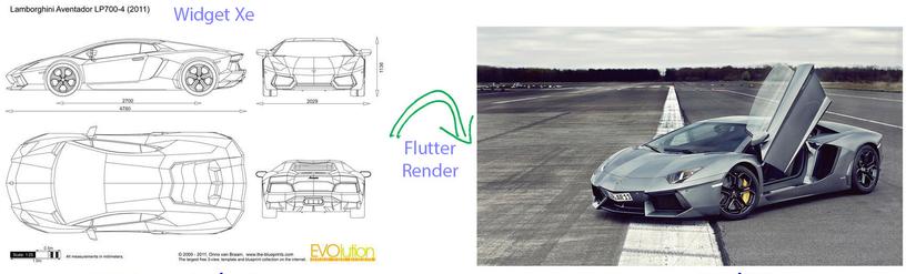 . Và câu nói này không hoàn toàn là sự thật, nó chỉ là bề nổi của tảng băng chìm mà thôi. Sự thật đến tận hôm nay mới được bật mí: Widget chính là một bản vẽ, một bản thiết kế như bản thiết kế "siêu xe" trong hình dưới đây. Flutter sẽ dựa vào bản thiết kế này và render ra cái hình ảnh UI hiển thị lên màn hình. Từng cái Text chúng ta đọc, từng cái Button để chúng ta click, cái Icon, cái Logo được hiển thị trên màn hình đó không phải là Widget mà chính xác là nó được dựng lên một bản thiết kế gọi là Widget.