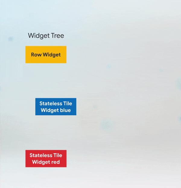 Tiếp theo, khi swap 2 widget Tile và thực hiện rebuild: Flutter sẽ walk down Element tree, từng Element sẽ kiểm tra cái Widget Type của Widget cũ và Widget mới có giống nhau hay không?. Bắt đầu từ thằng Element blue, nó thấy thằng cũ là Widget blue, được đổi thành Widget red nên nó nói rằng: "2 thằng này cùng Widget Type là Tile nên ta sẽ chuyển con trỏ từ Widget blue sang Widget red". Tiếp tục, đến Element red cũng so sánh như vậy nên cũng chuyển sang trỏ đến widget mới là Widget blue. Tóm lại cả 2 Element đều thay đổi, trỏ đến widget mới nên UI được update.