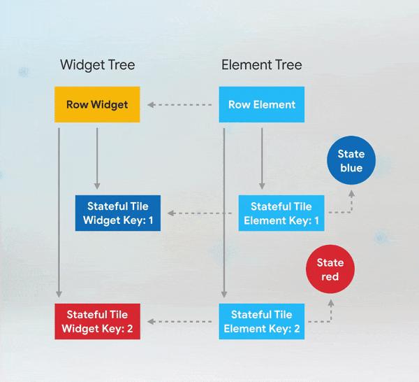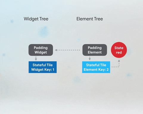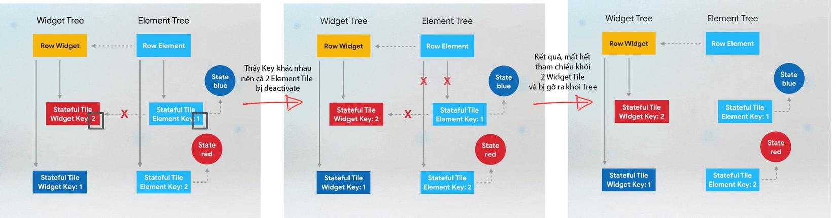 Tương tự ví dụ sử dụng StatelessWidget ở trên, khi rebuild, Flutter cũng sẽ walk down Element tree và so sánh, nó cũng thấy 2 widget cũ và 2 widget mới vẫn cùng 1 Widget Type là Tile. Kết quả, Element blue trỏ đến Widget red và Element red trỏ đến Widget blue. Nhưng nó chỉ thay đổi tham chiếu của biến widget chứ có thay đổi tham chiếu của biến _state đâu. Điều này dẫn đến: Element blue có biến widget trỏ đến Widget red nhưng _state vẫn trỏ đến State blue. Element red cũng thế, biến widget trỏ đến Widget blue nhưng _state vẫn đang trỏ đến State red. Trong khi State lại chứa data về màu sắc của widget Tile nên dù cho Widget có bị swap thì màu sắc vẫn không đổi
