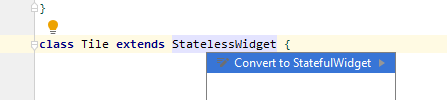 Để convert nhanh một StatelessWidget sang StatefulWidget trong Android Studio, bạn có thể đưa trỏ chuột đến dòng code class Tile extends StatelessWidget, press Alt + Enter chọn Convert to StatefulWidget