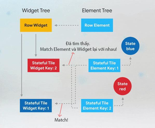 Nói một cách dễ hiểu hơn. Bình thường, nếu không có key thì Element và Widget chỉ là những kẻ vô danh. Có key rồi, nó giống như có một cái chứng minh nhân dân vậy, nó được xác định danh tính rõ ràng nhờ giá trị bên trong Key. Nhờ có danh tính rõ ràng mà Flutter sẽ dựa vào danh tính đó để tìm kiếm. Tìm kiếm thế nào thì mời bạn xem tiếp sẽ rõ.