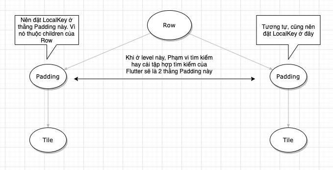 Từ lý thuyết trên, tự rút ra cho mình một cái tip là LocalKey chỉ nên được đặt ở các Widget là top level, level cao nhất trong list children của một Row hoặc một Column. Một Row, nó có nhiều đứa con có cùng một level, Flutter sẽ tìm trong mấy đứa con cùng level đó.