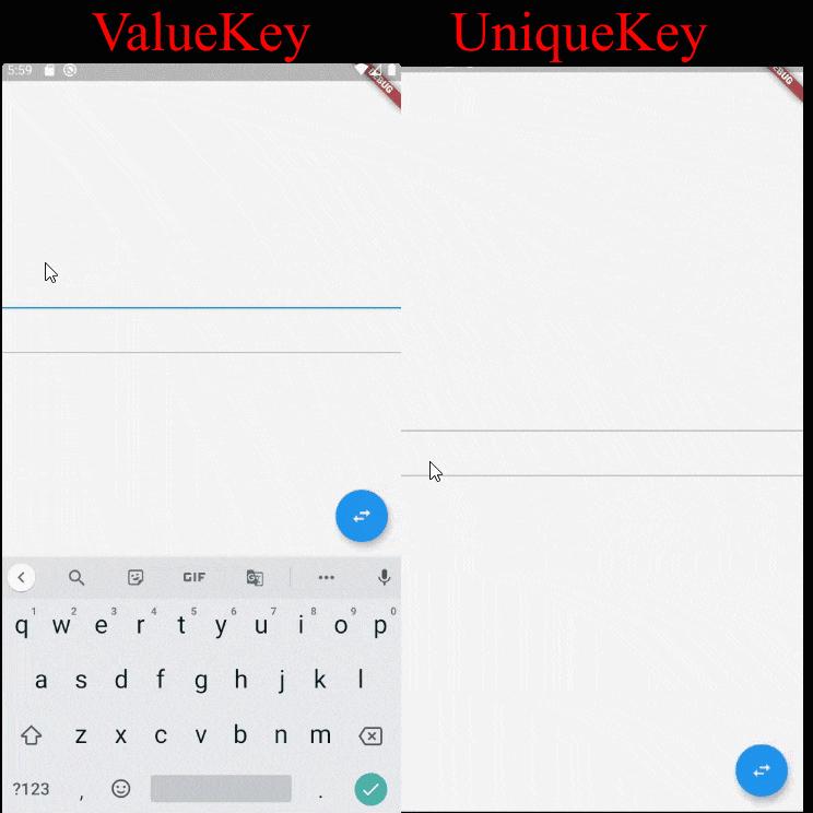 ValueKey, cũng không sử dụngUniqueKey, nói chung là không sử dụng Key thì kết quả sẽ như thế nào, Element TextField có bị deactivate hay bị dispose không?. - Câu 2: tại sao ngay từ đầu trong cái source này https://dartpad.dev/cbcf93cfd5655c514af90e87010be7c3 , mình sử dụng