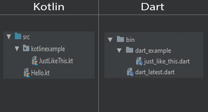 - Tên package/folder của Kotlin và Dart đều viết kiểu chữ thường (lower case) nhưng khác với Kotlin đặt tên package/folder không có dấu underscore