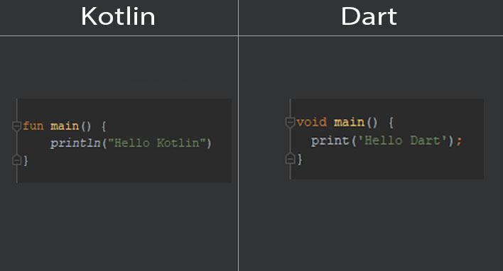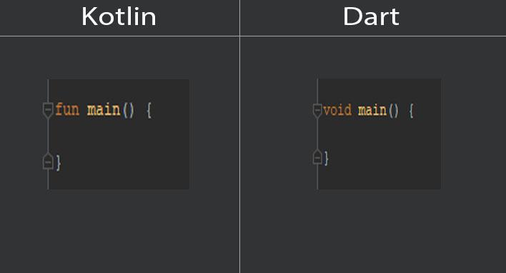 Cũng giống như Kotlin, hàm main() là hàm mà khi run project thì hàm này sẽ chạy đầu tiên. Khác biệt duy nhất ở đây chỉ là syntax. Kotlin dùng fun còn Dart dùng void (khá giống Java). Còn nhiều thứ Dart khá giống Java nữa nên nếu bạn nào đã học Java rồi thì học Dart sẽ khá dễ dàng. Tuy nhiên nhân vật chính trong bài viết của mình là Kotlin nên mình sẽ không nói nhiều về Java