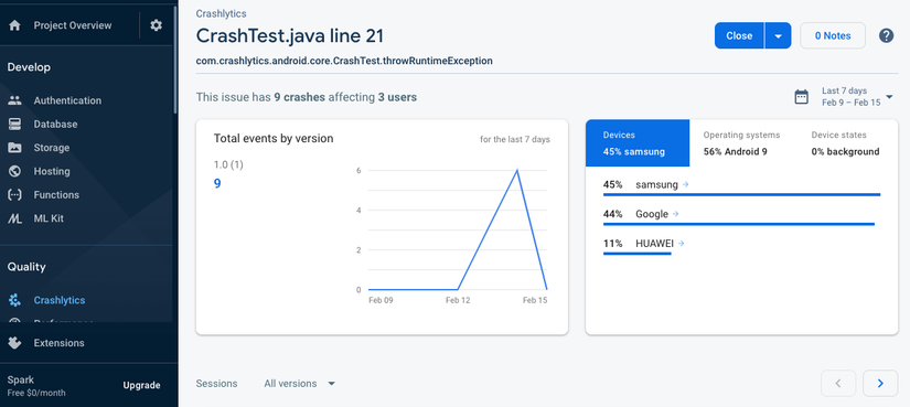Lần thử số 1: Sử dụng firebase.crashlytics().crash()