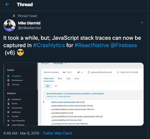 React Native Firebase Crashlytics đã được hỗ trợ JavaScript stack traces