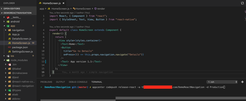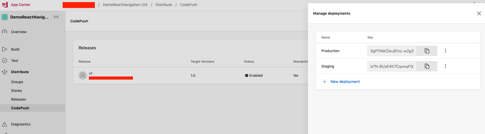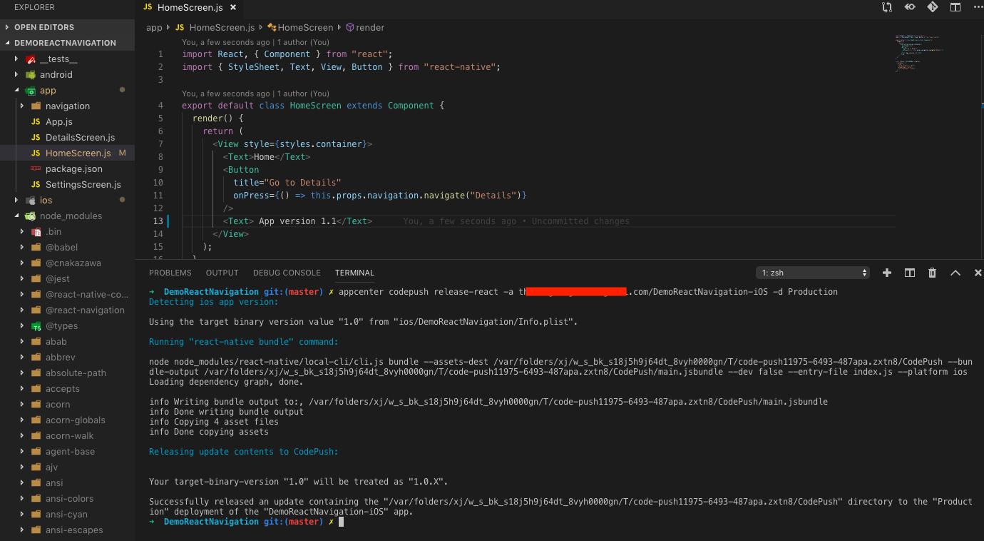 $ appcenter codepush release-react -a <ownerName>/DemoReactNavigation-iOS -d Production // iOS