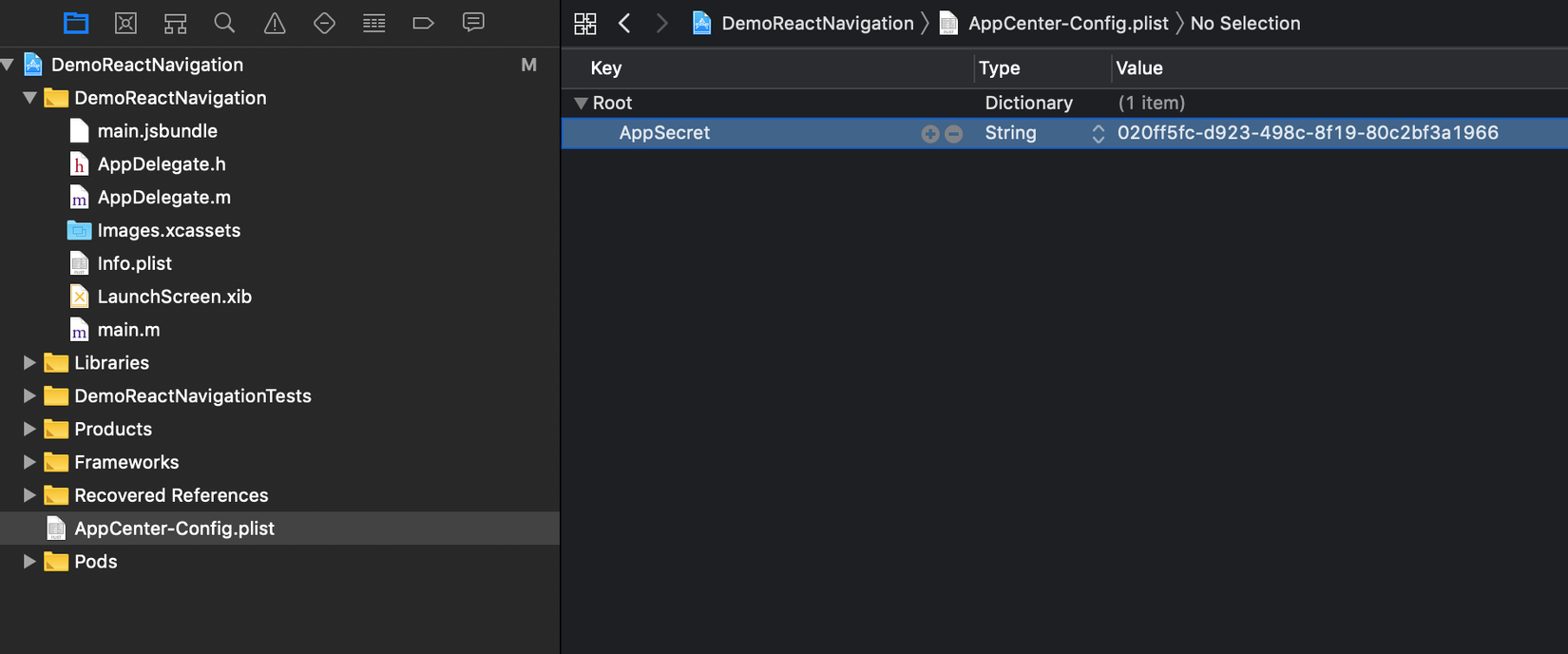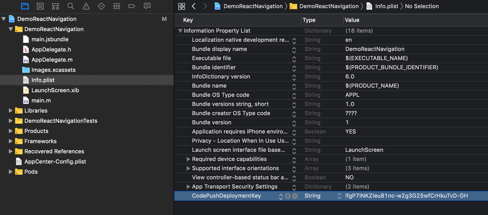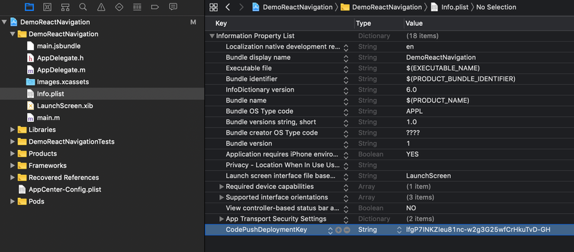 Các bạn vào app DemoReactNativigation-iOS rồi copy key sau vào project bên iOS nhé