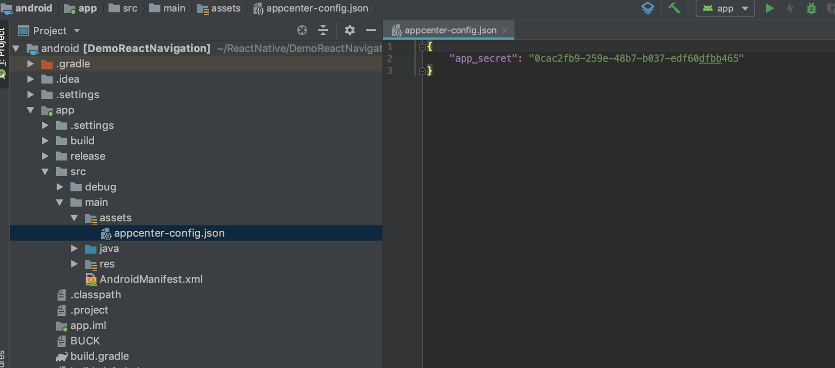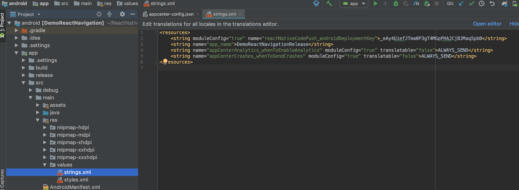Các bạn vào app DemoReactNativigation rồi copy key sau vào project bên Android nhé
