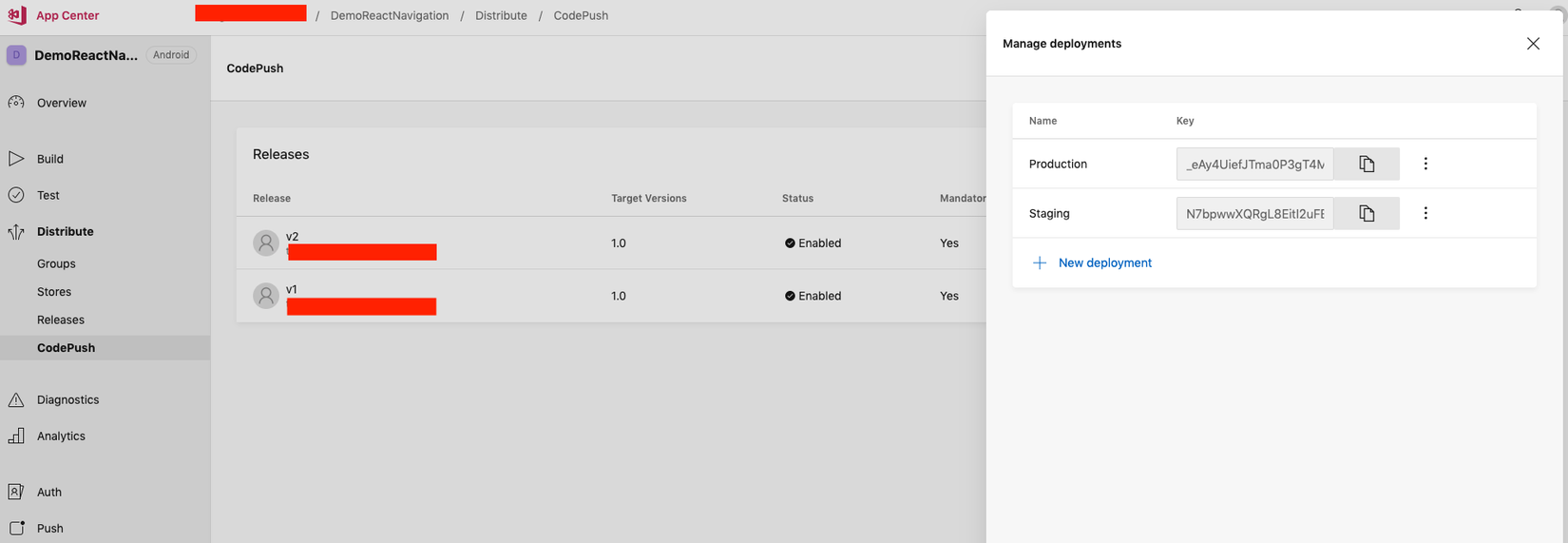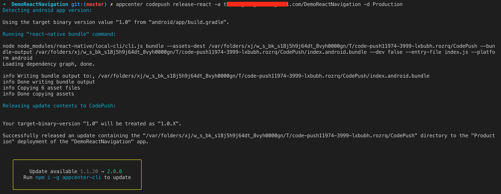 $ appcenter codepush release-react -a <ownerName>/DemoReactNavigation -d Production // Android