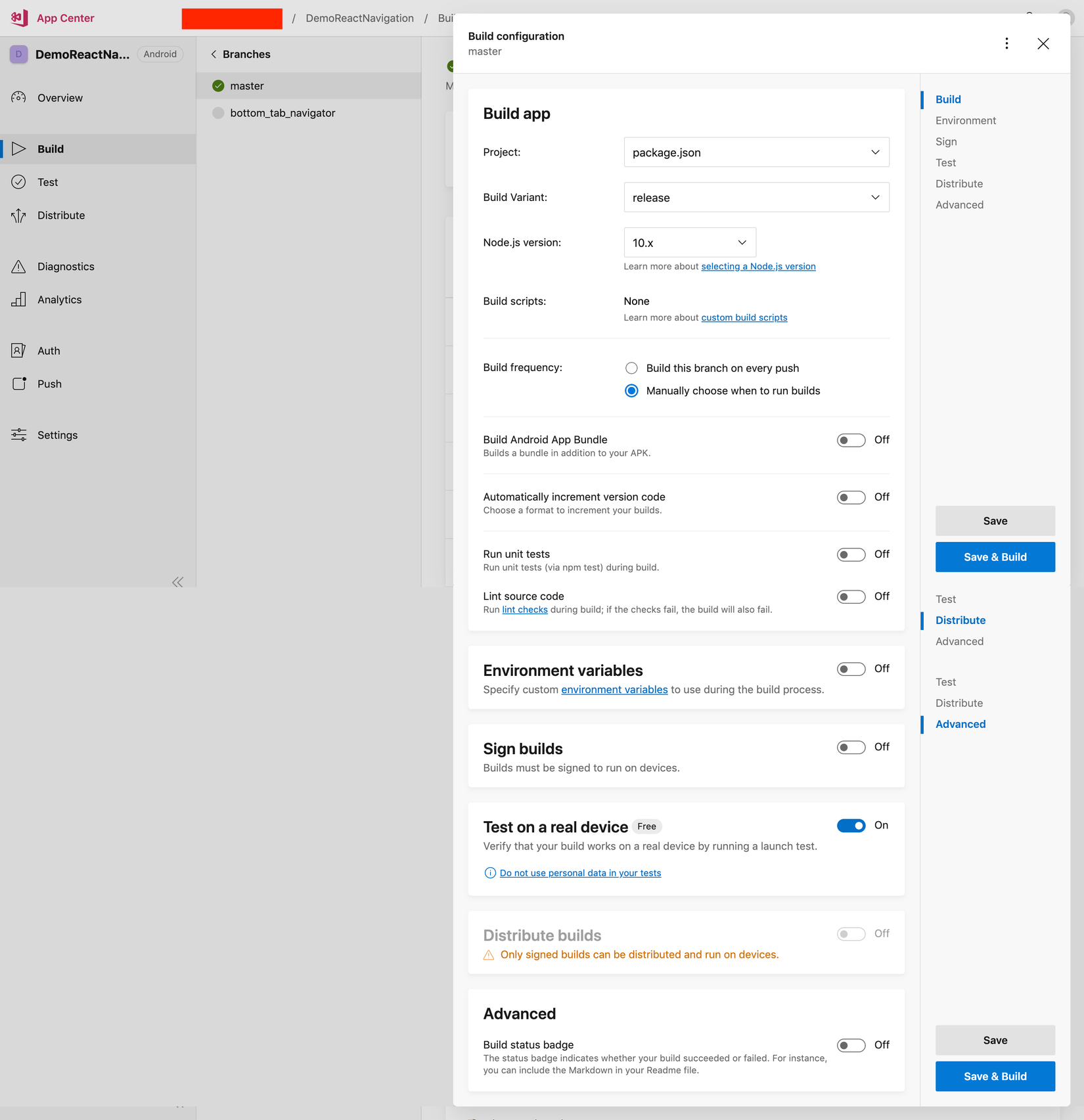 Build frequency thì bạn nên để manually nhé vì mỗi lần bạn push commit mới lên Repo thì appcenter sẽ tự động build khi bạn để chế độ build "every push". Còn 1 điều nữa bạn dùng tài khoản free nên sẽ có giới hạn thời gian build là 240 phút/tháng thôi. Bạn có thể tham khảo thêm tại đây https://visualstudio.microsoft.com/app-center/pricing/