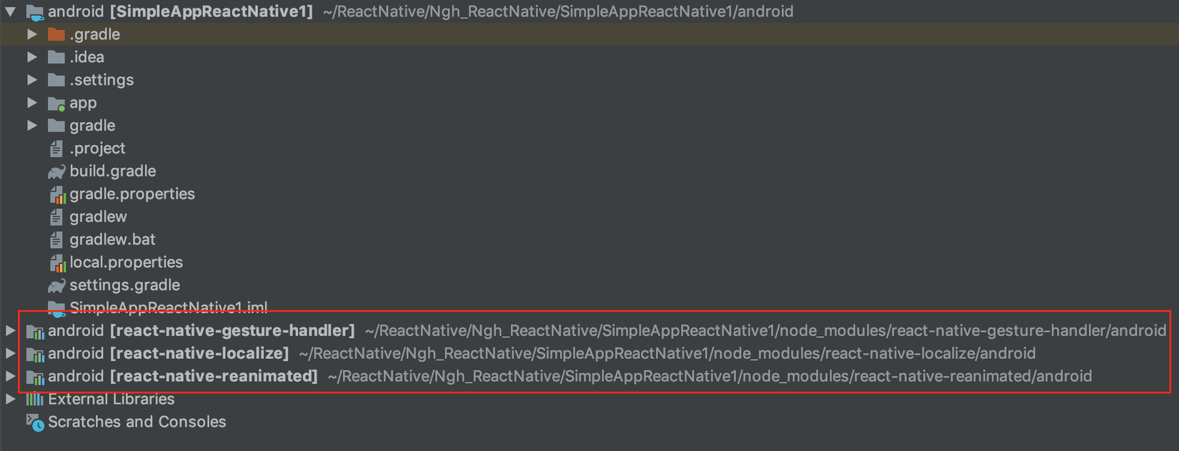 Do tôi dùng React Native >= 0.60 nên các thư viện sẽ được tự động import vào project Android như sau: