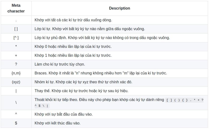 Meta Characters là các khối xây dựng của các biểu thức chính quy. Các ký tự meta không biểu diễn chính nó mà thay vào đó được diễn giải theo một cách đặc biệt nào đó. Một số ký tự meta có ý nghĩa đặc biệt và được viết bên trong dấu ngoặc vuông. Các ký tự meta như sau: