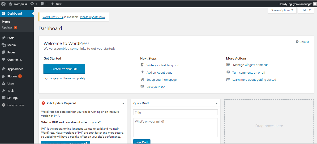 Dashboard: bao gồm một số mục chính: At a Glance, Quick Draft, Activity, Wordpress News. Chúng ta có thể sử dụng nó để viết bài hoặc tùy chỉnh cài đặt... phần này thường sẽ ít dùng tới