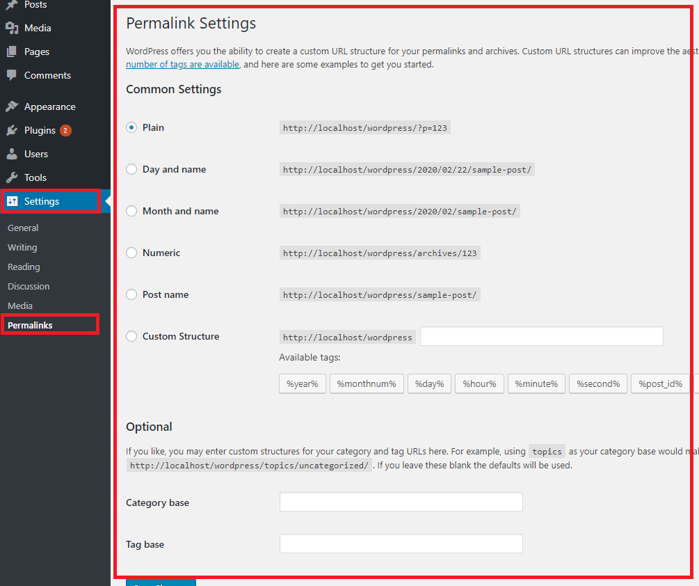 - Permalink Settings: cài đặt các URL cố định cho bài đăng trên blog