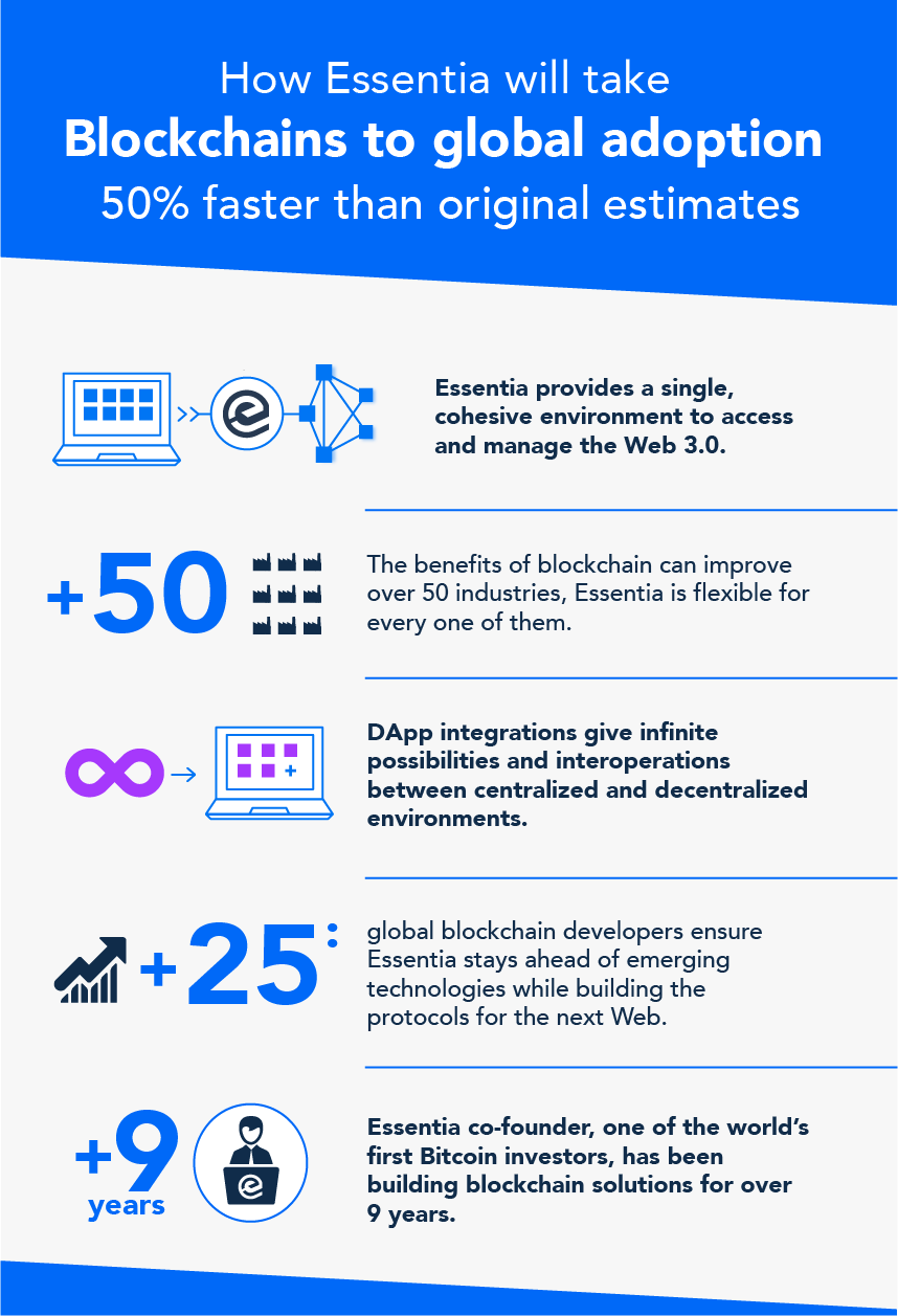 Essentia là phương tiện mà thế giới kỹ thuật số cần để tăng tốc quá trình chấp nhận blockchain. Một số gợi ý rằng chúng ta có thể thấy nó xảy ra sớm hơn 50% so với ước tính ban đầu, điều đó có nghĩa là vào khoảng năm 2020, hệ sinh thái internet có thể lấy lại khả năng tương tác, trong khi các blockchain phi tập trung lấp đầy khoảng trống của quyền riêng tư, bảo mật và quyền sở hữu dữ liệu.