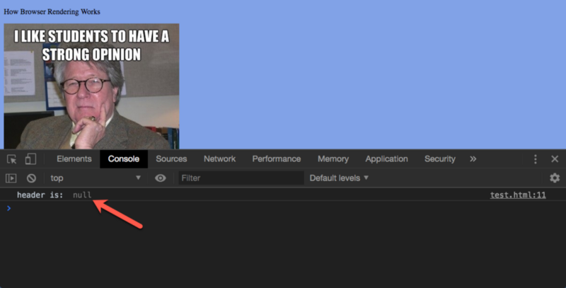 Vào thời điểm script cố gắng truy cập vào một nút DOM với một id là header, nó đã không tồn tại bởi vì DOM đã không hoàn thành phân tích các document!