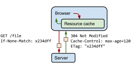 Trong ví dụ trên, client tự động cung cấp Etag token trong HTTP request header "If-None-Match". Server sẽ kiểm tra token dựa trên resource hiện tại. Nếu token không có sự thay đổi, server sẽ trả về một response "304 Not Modified" để thông báo cho Browser biết response đã có trong cache không có sự thay đổi và có thể sử dụng nó trong 120s nữa.