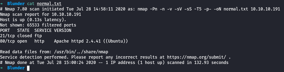 nmap -Pn -n -v -sV -sS -T5 -p- -oN normal.txt 10.10.10.191