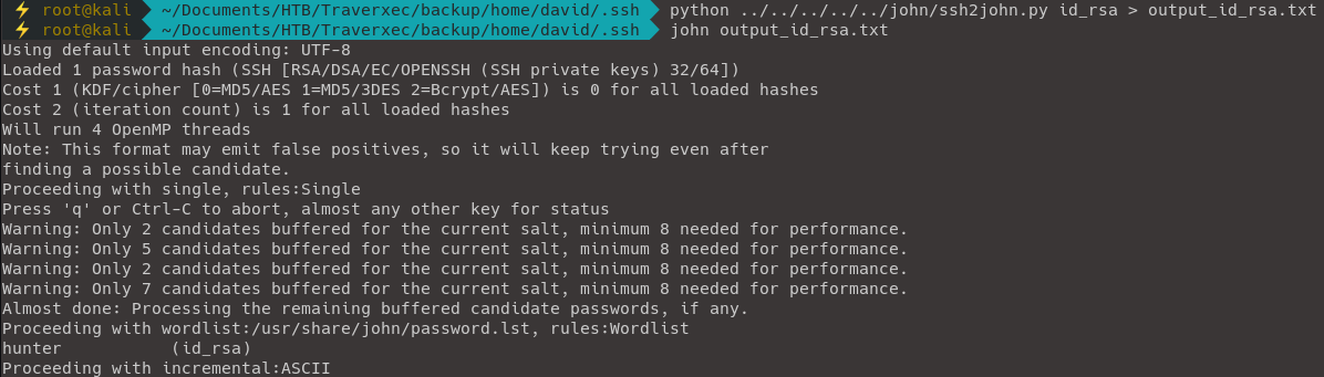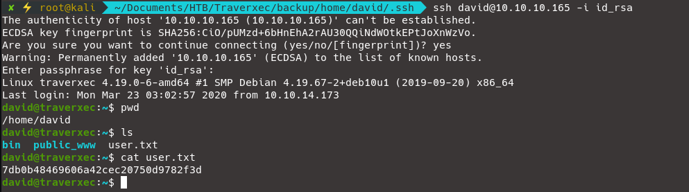 Ta có password cho id_rsa là hunter, dùng nó để ssh tới machine dưới tên david và lấy user flag: