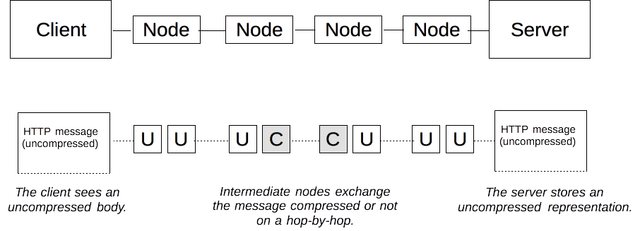 Trên thực tế trên các kết nối giữa các node này có thể sử dụng các thuật toán nén khác nhau. Để làm được việc này, HTTP cũng sử dụng cơ chế content negotiation như đã đề cập ở phần nén end-to-end.