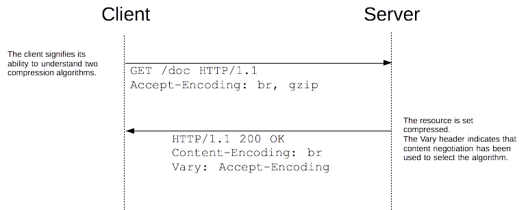 Để lựa chọn phương pháp nén, trình duyệt và server sử dụng cơ chế content negotiation bằng cách trình duyệt gửi cho server thuật toán nén thông quaAccept-Encoding header với các thuật toán hỗ trợ và thứ tự ưu tiên từ trái qua phải. Sau đó server sẽ chọn một trong số đó, sử dụng thuật toán đó để nén body sau đó thông báo lại cho trình duyệt thuật toán mình đã sử dụng thông qua Content-Encoding header