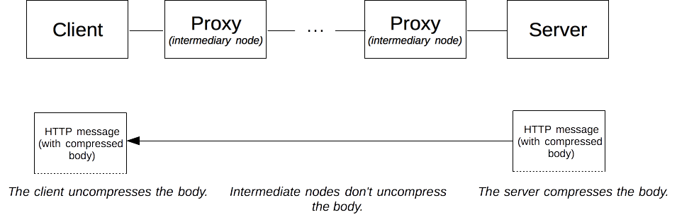 Nén end-to-end là phương pháp cải thiện hiệu suất đáng kể của trang web. Toàn bộ phần body của message sẽ được nén trên server sau đó được gửi tới client. File nén này sẽ không thay đổi trong quá trình gửi về client, dù có thể đi qua những nodes trung gian(Mình sẽ giải thích ở phần sau cách nodes này).