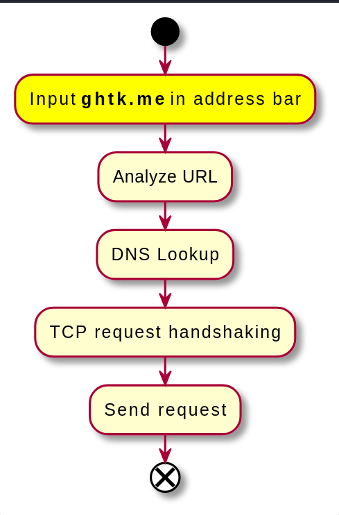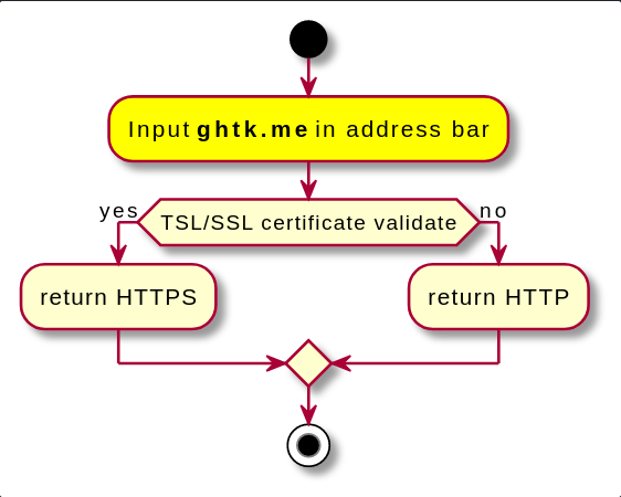 Giả định rằng đoạn text user nhập là một URL (VD: ghtk.me): Khi submit request, trình duyệt sẽ tiến hành build full URL. Sau đó sẽ tiến hành kiểm tra website có URL vừa nhập vào có được cấp chứng chỉ TLS/SSL. Điều này giúp trình duyệt build URL dạng HTTP hoặc HTTPS