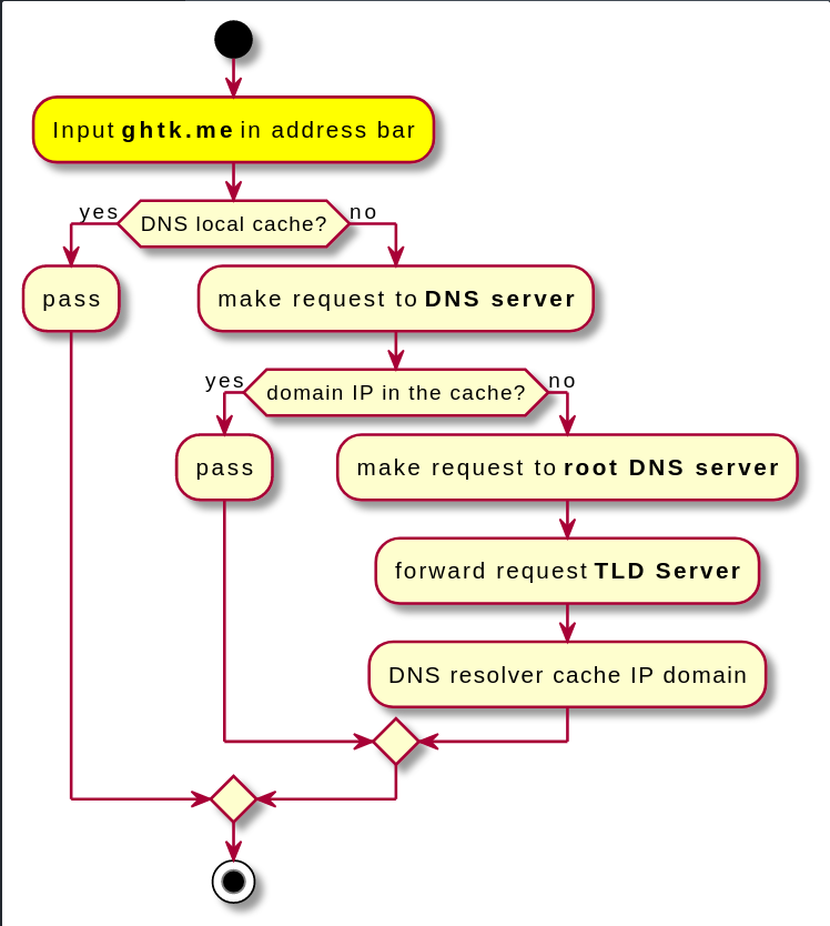 Server DNS có thể đã có domain IP trong bộ nhớ cache. Nếu không nó sẽ hỏi server DNS gốc - root DNS server(*). Giả sử nếu tìm kiếm url ghtk.me, ngay sau khi root DNS server nhận được yêu cầu, nó sẽ chuyển tiếp yêu cầu đến TLD Server (Top-level Domain Server) để lấy ra địa chỉ IP của URL với tên miền .me.