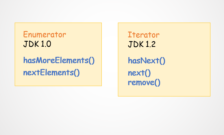 Ở Java, enumerator và iterator đều là những con trỏ để duyệt và truy cập phần tử của 1 collection như Vector, Stack, Hashtable,.... Enumerator xuất hiện ở JDK 1.0 và Iterator được ra mắt ở JDK 1.2. Enumerator cung cấp 2 phương thức hasMoreElement() và nextElement() để kiểm tra sự tồn tại và lấy phần tử tiếp theo trong collection. Tuy nhiên, nó không hỗ trợ các method để thay đổi cấu trúc của collection, và Iterator xuất hiện như là phiên bản cải tiến của enumerator, với các phương thức hasNext(), next() và remove().