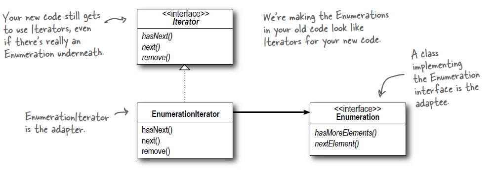 Lưu ý rằng, adapter chuyển từ hasNext(), next() sang hasMoreElements() và nextElement() là có thể, nhưng vì enumeration vốn không hỗ trợ remove() nên adapter cũng phải bó tay, không thể triển khai một hàm remove() đủ chức năng ở trong class adapter được. Lúc này, ta có thể chọn phương án throw exception để báo cho client.