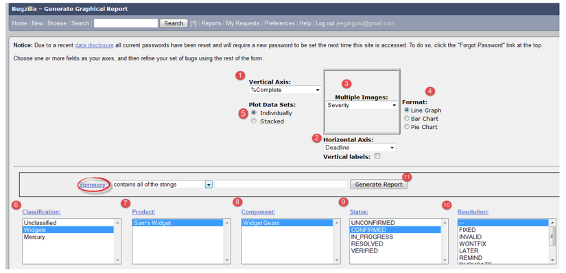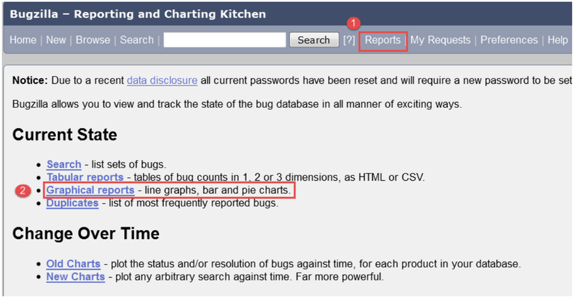 Báo cáo biểu đồ là một cách để xem trạng thái hiện tại của lỗi. Bạn có thể chạy các báo cáo thông qua bảng HTML hoặc biểu đồ cột / tròn. Ý tưởng đằng sau biểu đồ báo cáo trong Bugzilla là xác định một tập hợp các lỗi bằng giao diện tìm kiếm tiêu chuẩn và sau đó chọn một số khía cạnh của tập hợp đó để vẽ trên trục ngang và trục dọc. Bạn cũng có thể nhận được báo cáo 3 chiều bằng cách chọn tùy chọn "Multiple Pages".