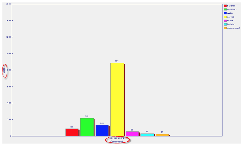 Biểu đồ bên dưới là biểu đồ cột thể hiện mức độ nghiêm trọng của bug trong thành phần "Widget Gears".Ở biểu đồ bên dưới, các lỗi nghiêm trọng nhất (màu đỏ) có số lượng là 88 trong khi các lỗi có mức độ nghiêm trọng bình thường (màu vàng) là 667 lỗi.