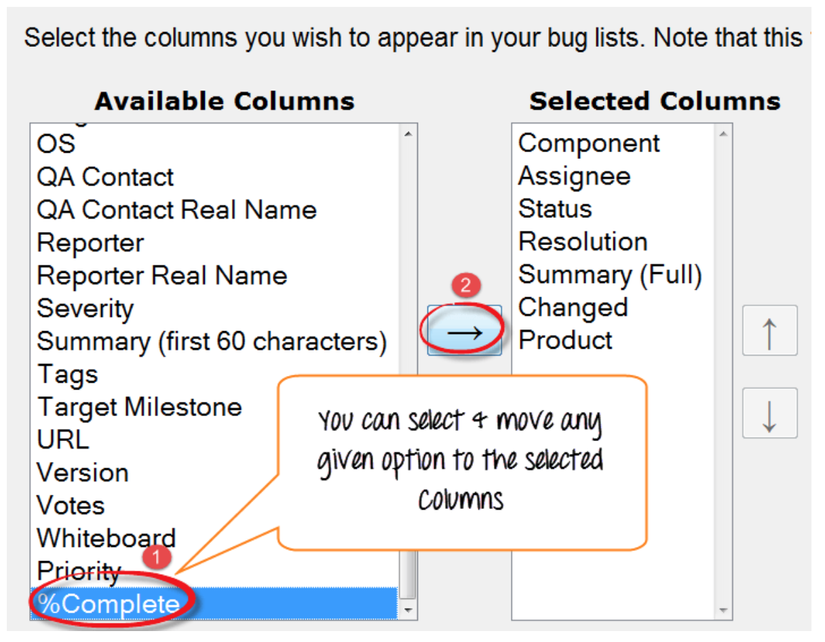- Nhấp vào nút mũi tên , nó sẽ di chuyển cột % hoàn thành từ cột có sẵn sang cột đã chọn Các bước này sẽ di chuyển cột được chọn từ trái sang phải.