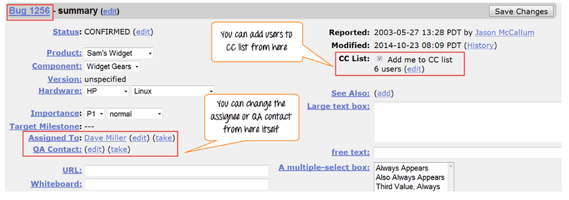 Nó sẽ mở một cửa sổ khác, nơi thông tin về lỗi của bạn có thể được nhìn thấy chi tiết hơn. Trong cùng một cửa sổ, bạn cũng có thể thay đổi người được assignee, liên hệ QA hoặc danh sách CC.