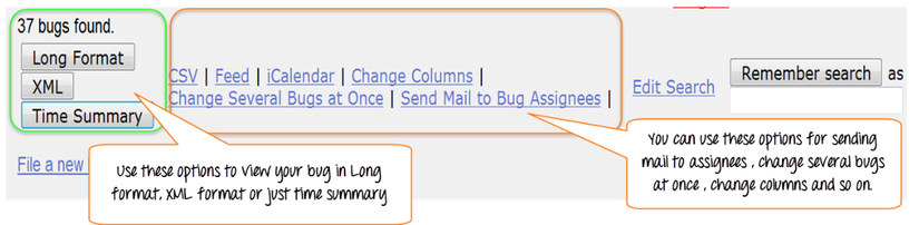Ngoài ra, ở phía dưới màn hình, bạn có nhiều tùy chọn khác nhau như cách bạn muốn xem lỗi của mình - định dạng XML, Long format hoặc chỉ tóm tắt thời gian . Ngoài ra, bạn cũng có thể sử dụng tùy chọn khác như gửi mail đến người được assignee lỗi, thay đổi một số lỗi cùng một lúc hoặc thay đổi cột của màn hình, v.v.