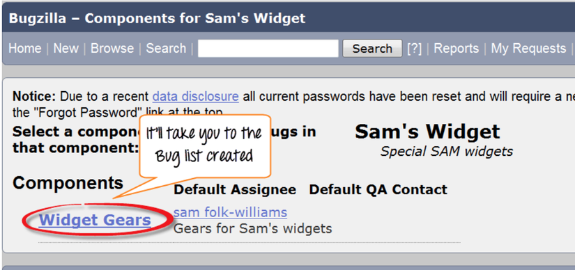Một cửa sổ khác hiện ra, click vào "widget gears" . Thành phần Bugzilla là các phần phụ của sản phẩm. Chẳng hạn, trong đó sản phẩm của chúng tôi là WIDGET SAM có thành phần là WIDGET GEARS .