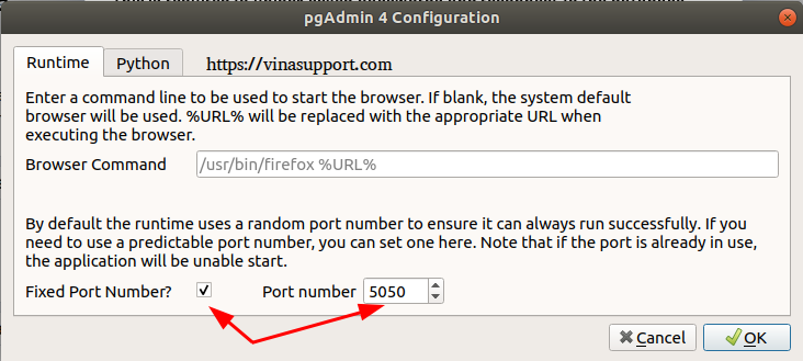 Vì mặc định, pgadmin 4 sẽ mở web browser bằng 1 random cổng, để cố định cổng của pgadmin 4 thì chúng ta thực hiện như sau: