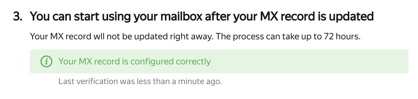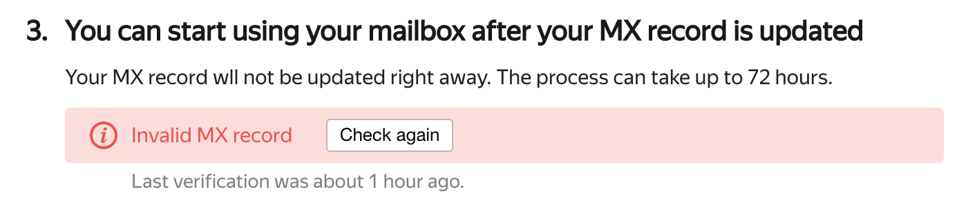 Sau khi thêm thành công MX Record trong trang quản lý DNS .Hệ thống của Yandex sẽ tự động cập nhật .. nếu không mọi người có thể cập nhật thủ công lại bằng cách click vào nút ‘Check again’