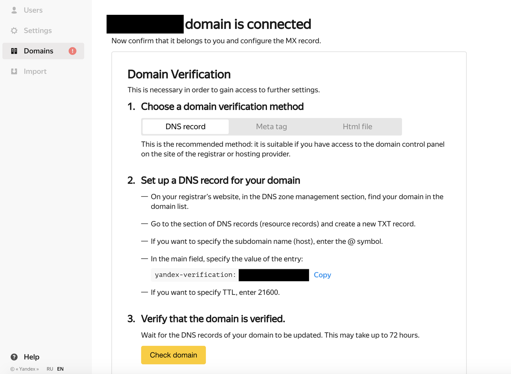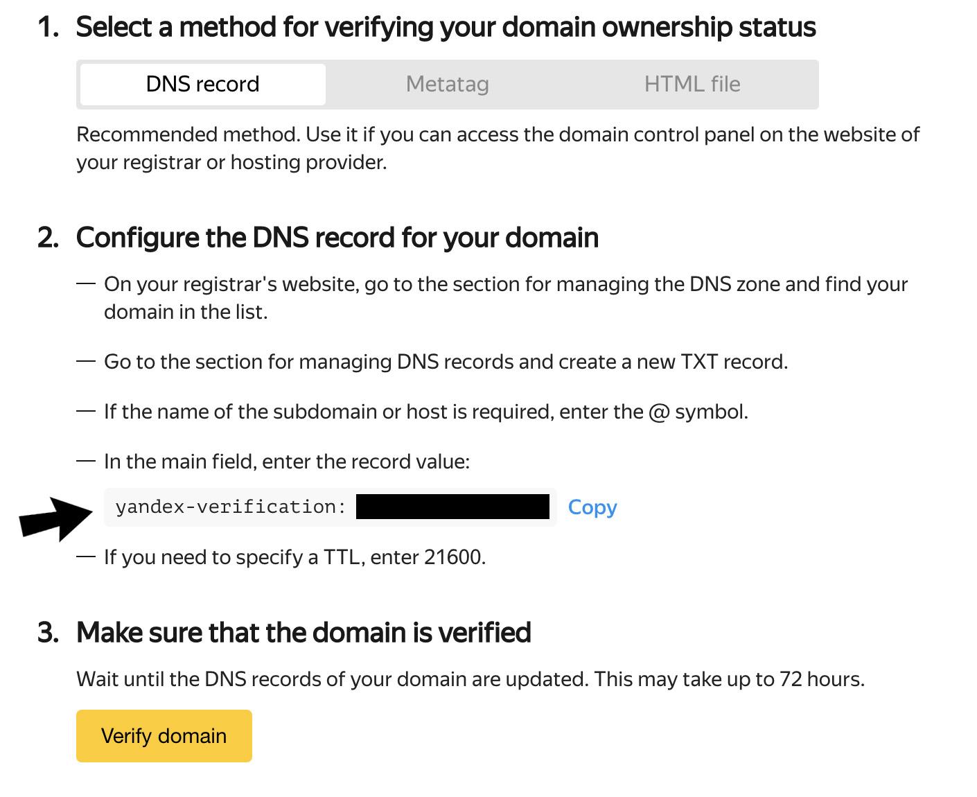 Tiếp theo :sau khi nhập tên miền và kết nối thành công .Yandex sẽ tự động chuyển hướng mọi người tới trang ‘Domain Verification‘ như hình dưới :