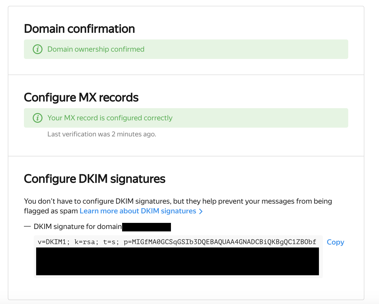 Sau khi cấu hình thành công MX Record ,Yandex sẽ tiếp tục hiển thị thêm một tuỳ chọn đó là cấu hình chữ ký DKIM (không bắt buộc)