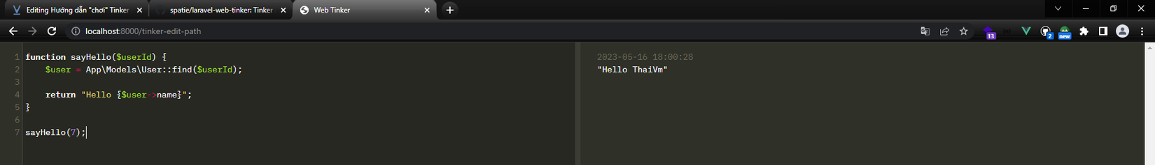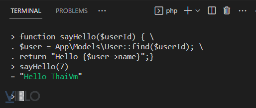 enterthì tinker sẽ hiểu đó là kết thúc câu lệnh. Vì vậy, để viết function trong tinker, bạn có thể sử dụng\để kết thúc từng dòng lệnh và bắt đầu dòng tiếp theo với...> function sayHello($userId) { \ . $user = App\Models\User::find($userId); \ . return "Hello {$user->name}";} => null > sayHello(7) => "Hello ThaiVm"![]()