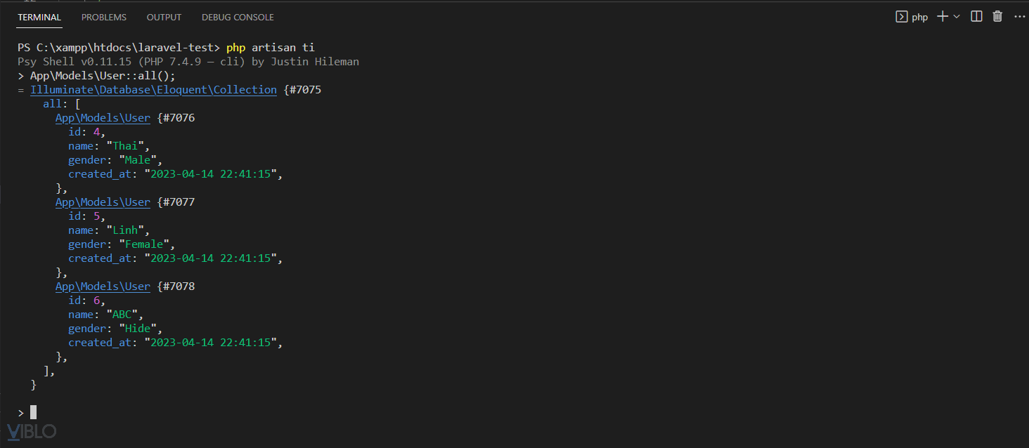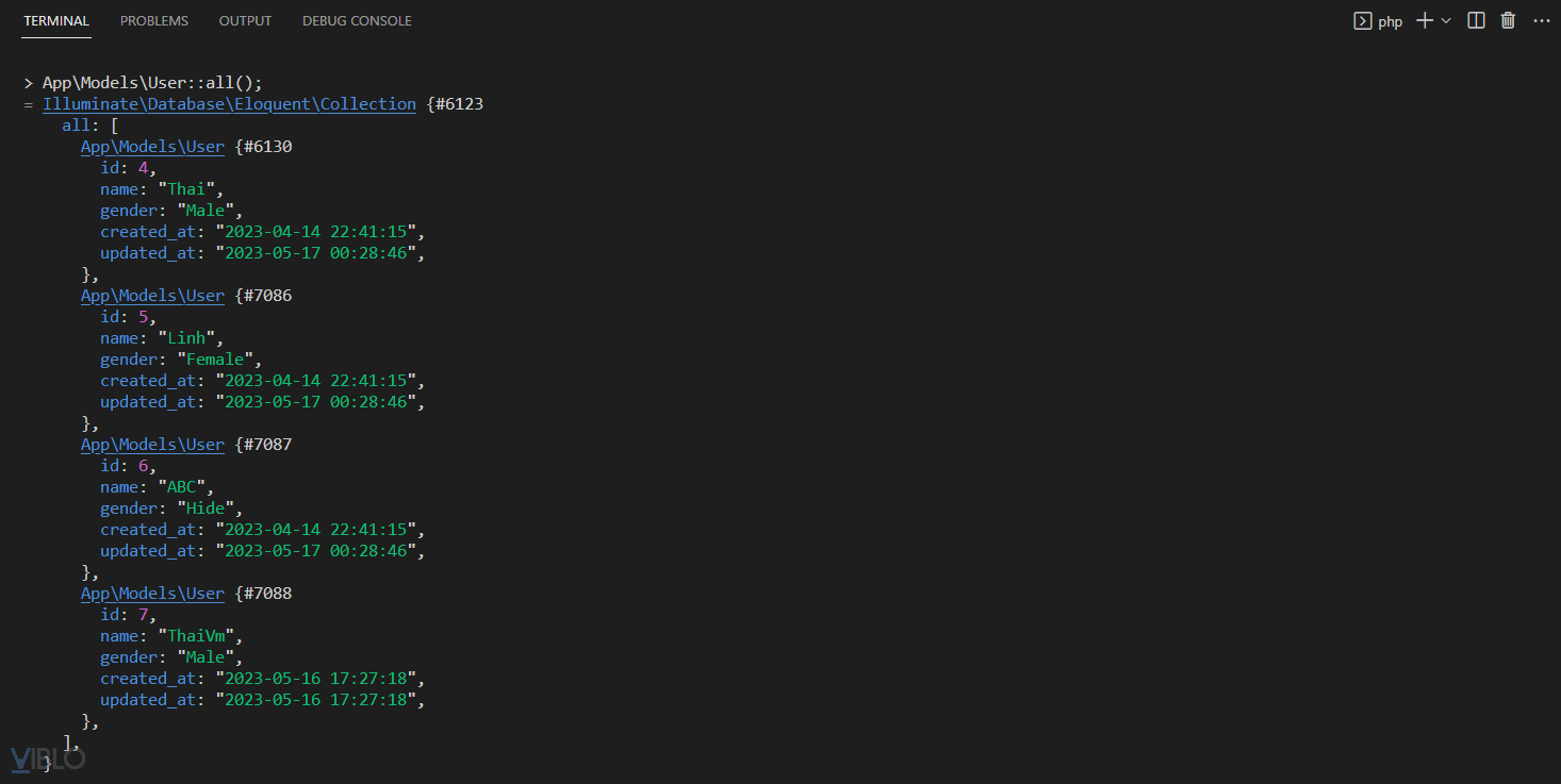 $user = new App\Models\User; $user->name = "ThaiVm"; $user->gender = "Male"; $user->save(); App\Models\User::all();![]()