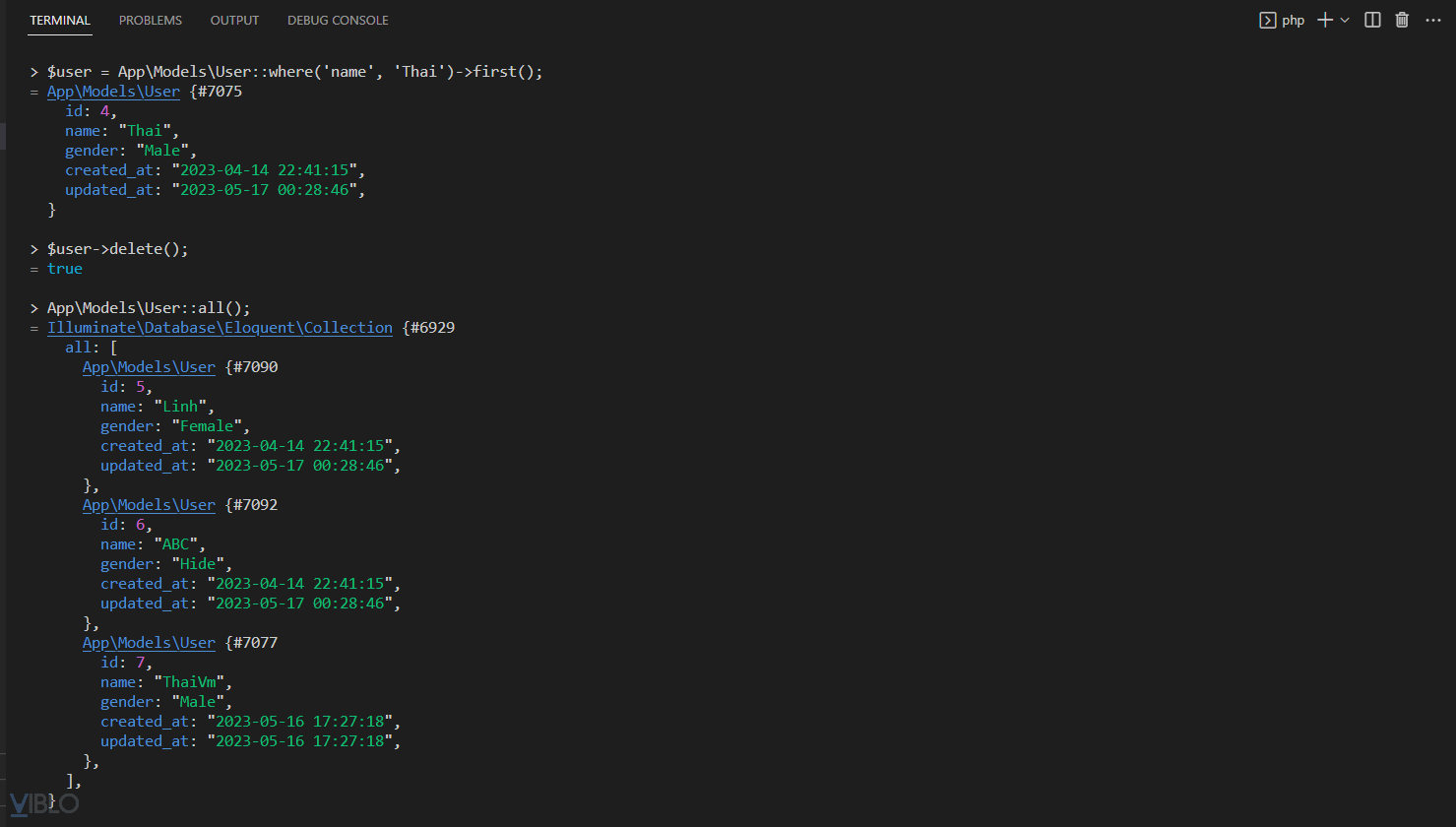 $user = App\Models\User::where('name', 'Thai')->first(); $user->delete();![]()