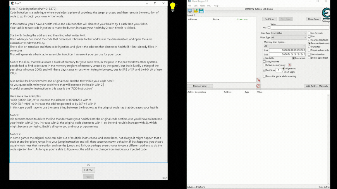 Cheat Engine có các tính năng giúp chúng ta đơn giản hóa việc code injection, bao gồm tích hợp script code vào CheatTable để dễ dàng enable/disable script, Injecting a DLL, LUA script. Chúng ta sẽ bắt đầu làm quen với code injection thông qua CE tutorial step 7.