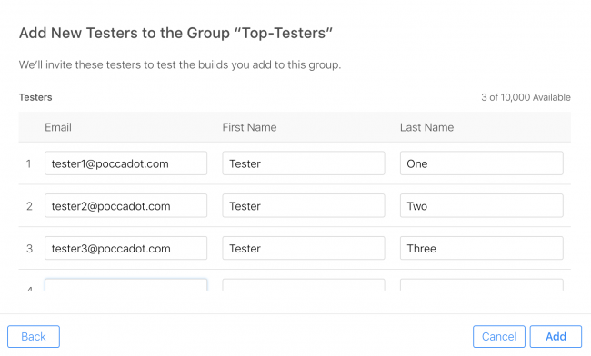 Thêm địa chỉ email, tên và họ của bất kỳ người kiểm tra bên ngoài nào bạn muốn thêm. Khi bạn đã hoàn tất, nhấp vào Add. Bạn luôn có thể thêm nhiều người kiểm tra bên ngoài bằng cách nhấp vào nút + trên testing group page. Tất cả những người kiểm tra bên ngoài đều được tính vào giới hạn 10.000 người: