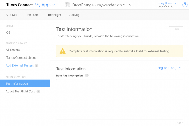 Bạn phải cung cấp thông tin này để gửi bản build cho thử nghiệm bên ngoài. Sau khi hoàn thành, nhấp Save.