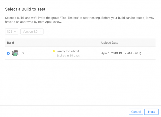 Ví dụ: người kiểm tra bên ngoài của bạn có thể đang kiểm tra bản phát hành tiếp theo của bạn, nhưng người kiểm tra nội bộ của bạn đang kiểm tra bản build chính thức của bạn. Bằng cách làm cho bạn chọn một bản build cho người kiểm tra nội bộ và bên ngoài một cách riêng biệt, iTunes Connect cho phép loại tách này. Tương tự, bạn có thể chọn các bản build khác nhau cho các nhóm thử nghiệm khác nhau.